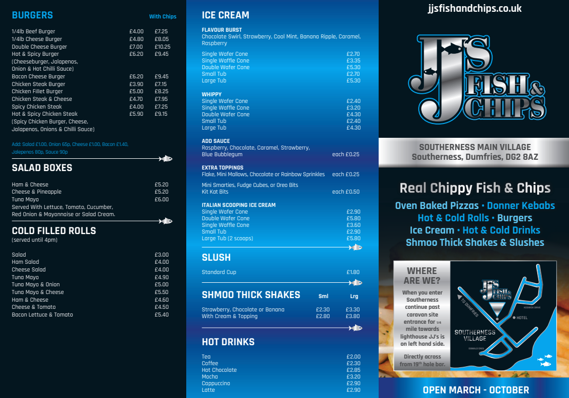 Ian and Sharon would like to welcome you to JJ’s Fish & Chips at Southerness, SW Scotland.